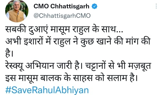 बिलासपुर- मुख्यमंत्री भूपेश बघेल दिल्ली में है लेकिन उनकी संवेदना राहुल के साथ है खुद मुख्यमंत्री अपने व्यस्ततम दिल्ली दौरे के बीच राहुल के सकुशल निकलेने पर नजर बनाए हुए है ,राहुल तक पहुंचने में रक्षा टीम को कुछ देर और लगाना है चार दिन से तपती धूप में राहुल को बचाने पूरा जिला प्रशासन लगा हुआ हैंलोगों कि दुआएँ लगी हुई है ,खुद सीएम बघेल राहुल के जज्बे को सलाम करने के साथ ईश्वर से राहुल के सकुशल निकलने की प्रार्थना कर रहे है जिस तरह से राहुल को बचाने का प्रयास जिला प्रशासन ने किया किया है वह सराहनीय है लागतार रक्षा टीम राहुल का हौसला बढ़ा कर रखे हुए है ।