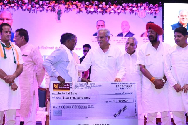 मुख्यमंत्री बघेल ने भोजराज साहू, रघुवर प्रसाद, परमेश्वर निर्मलकर, घनश्याम, खेलन राम, पार्वती, कुमारी बाई, तोषण, शकुंतला सहित अन्य लोगों को सांकेतिक रूप से चेक भी प्रदान किया।