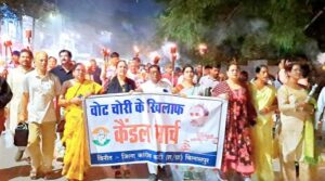 कांग्रेसजन शाम 6.00 बजे नेहरू चौक में एकत्रित हुए फिर कैंडल मार्च नारो के साथ निकाला गया ,” वोट चोर – गद्दी छोड़” “लोक तंत्र के गला घोंटने वालो -गद्दी गद्दी छोड़ो ” “