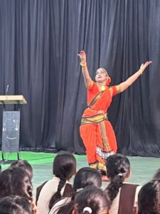कार्यक्रम के अंतर्गत आयोजित इंटरएक्टिव सत्र में विद्यार्थियों ने कलाकार से संवाद कर भारतीय शास्त्रीय कलाओं की साधना, अनुशासन और महत्व को समझाया। अपने प्रस्तुति में उन्होंने दुर्गा स्तुति, कृष्ण लीला और महाभारत के एक प्रभावशाली प्रस्तुतीकरण – द्रौपदी चीरहरण शामिल थे। उनके प्रदर्शन ने दर्शकों को मंत्रमुग्ध कर दिया, जिसमें कुचिपुड़ी नृत्य की गहराई, भाव और कहानी कहने की शक्ति का खूबसूरती से प्रदर्शन किया गया। उनके साथ सुश्री सौम्या (वोइलिन) , श्री विग्नेश (मृदंग) , श्री कोट्टकल (गायक) ने मिलकर लय, राग और अभिव्यक्ति का एक भावपूर्ण मिश्रण प्रस्तुत किया, जिसने छात्रों और कर्मचारियों, दोनों के लिए अनुभव को समृद्ध बनाया।