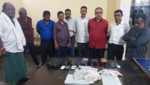 मौके से ₹69,300 नगद, 03 कार एवं 10 मोबाइल फोन जप्त किए गए।