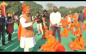 बिलासपुर, 12 जनवरी,2026/उप मुख्यमंत्री सह खेल मंत्री अरुण साव के मार्गदर्शन में आज स्वामी विवेकानंद जयंती राष्ट्रीय युवा महोत्सव पर बिलासपुर शहर ने इतिहास रचा है। खेल एवं युवा कल्याण विभाग द्वारा पुलिस ग्राउंड में आयोजित स्वामी विवेकानंद चेतना महोत्सव में 1500 बच्चों ने स्वामी विवेकानंद की वेशभूषा में सामूहिक रूप से पूर्ण वंदेमातरम का गायन किया। इस अवसर पर डिप्टी सीएम अरुण साव ने 1500 बच्चों को नशामुक्ति की शपथ दिलाई। और दूसरों को भी नशा के खिलाफ जागरूक करने का संकल्प लिया। डिप्टी सीएम अरुण साव ने इस विश्व रिकॉर्ड के लिए गोल्डन बुक ऑफ वर्ल्ड रिकॉर्ड का प्रमाण पत्र प्राप्त किया।