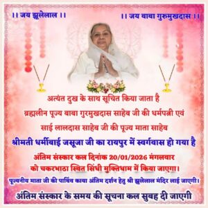 *सतगुरु साईं लालदास साहब की पूज्यनीय माता ,ब्रह्मलीन बाबा गुरमुखदास साहब की धर्मपत्नी श्रीमती धर्मीबाई जसूजा का रायपुर में स्वर्गवास हो गया है।*